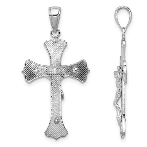 14k white gold crucifix pendant has filigree embellished tips. Item size: 26mm x 18mm without bail. Weight: 1.9 grams. Made in USA.