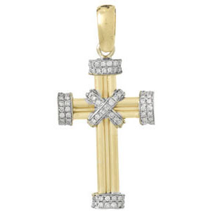 14k yellow gold cross pendant has 14k white gold tips and is encrusted with .42 carat diamond accents. Item size: 1in x 5/8in. Made in USA.
