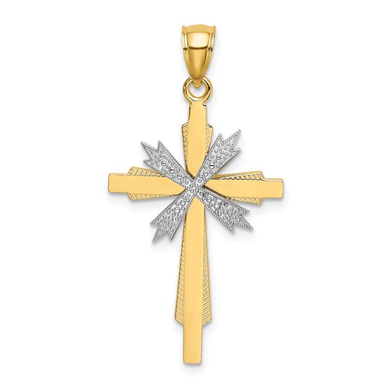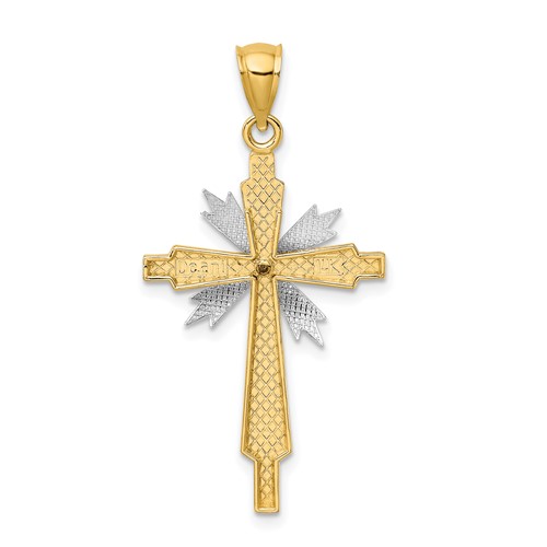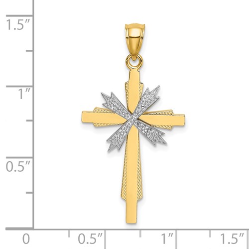 14k two-tone gold cross pendant has a high polished finish and beaded white gold accent. Weight: 2.0 grams. Item size: 1in x 5/8in. Fits up to a 3mm wide chain. Made in USA.