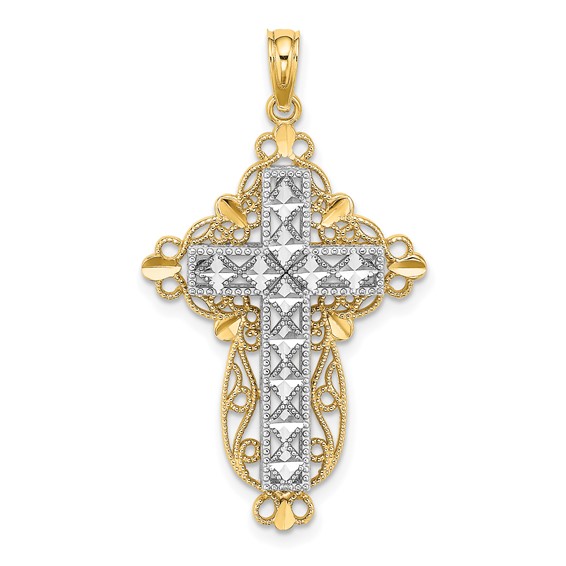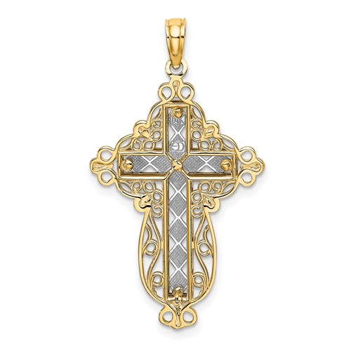 14k white gold block diamond cut cross on yellow gold filigree cross pendant. Weight: 2.8 grams. Measures 32mm x 17mm. Fits up to a 3mm wide chain.