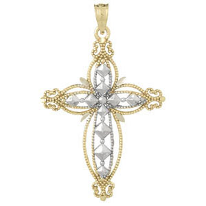 14kt yellow gold beaded cut-out cross pendant with white gold diamond cut accents. Weight: 2.1 grams. Measures 35mm by 21mm.