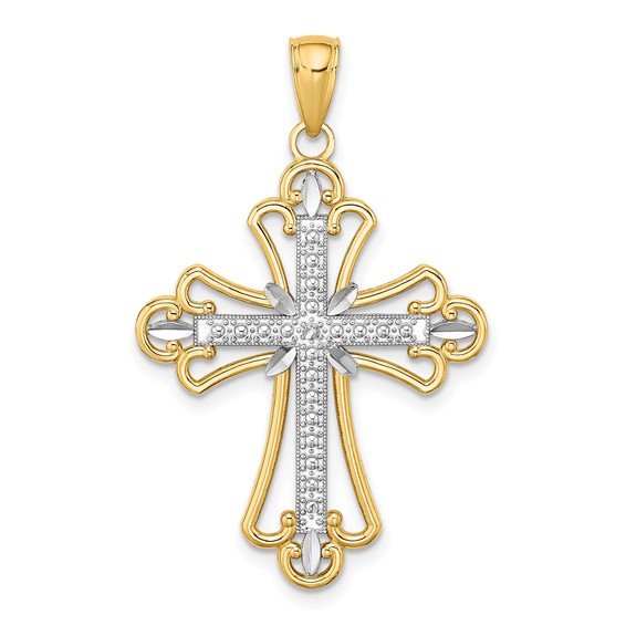 14kt yellow gold cut-out cross pendant has a white gold beaded texture cross in the center. Item size: 1in x 3/4in. Weight: 2.0 grams. Made in the USA.