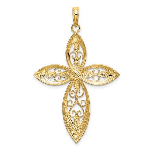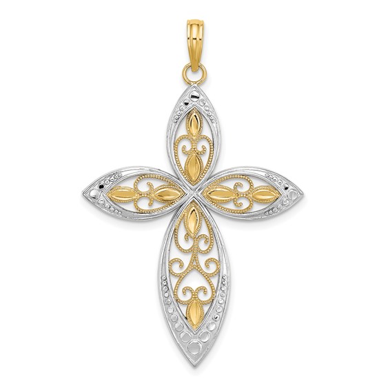 This large solid 14k white gold figure eight cross pendant has beaded tips and yellow gold beaded filigree center. Weight: 2.3 grams. Measures 1.5 inches x 1 inch without bail. Fits up to a 3mm wide chain. Made in Peru. Ships from USA.