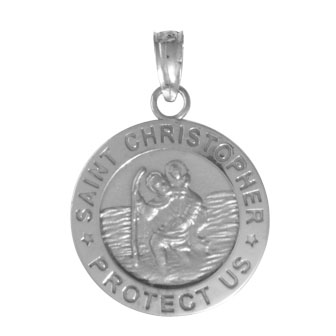 This tiny Saint Christopher Protect Us coin pendant is made of 14kt white gold. Item size: 1/2in x 1/2in. Weight: 1.7 grams. Made in the USA.