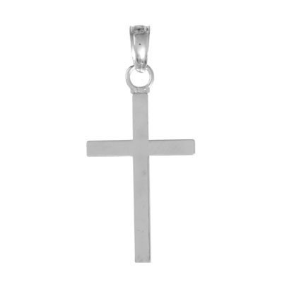 14kt white gold 3-D high polished block cross pendant. Weight: 0.7 grams. Measures 22mm by 9mm.