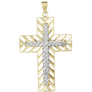14kt white gold diamond cut white gold cross on cut-out yellow gold cross pendant. Dimensions: 43mm x 25mm. Weight: 2.9 grams.