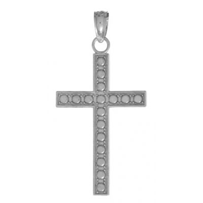 Beaded block cross pendant is made of polished 14k white gold. Measures 7/8in x 1/2in. Weight: 0.9 grams. Made in USA.