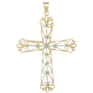 This large 14k two-color gold cross pendant has beaded cut-out hearts inside and white gold diamond cut tips. Dimensions: 1 5/8in x 1 1/4in without the bail. Weight: 2.7 grams. Made in USA.