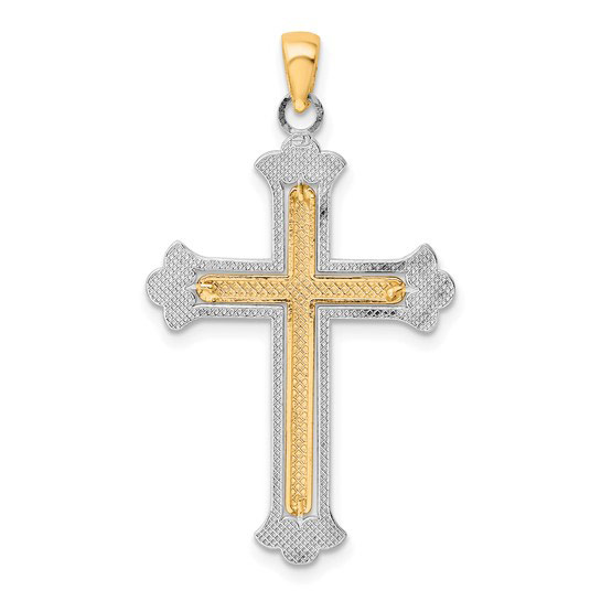 Solid 14k yellow gold stick cross has a 14k white gold fleur de Lis frame. Measures 1in x 3/4in without bail. Weight: 2.7 grams. Fits up to a 3.5mm wide chain. Made in Peru. Ships from USA.
