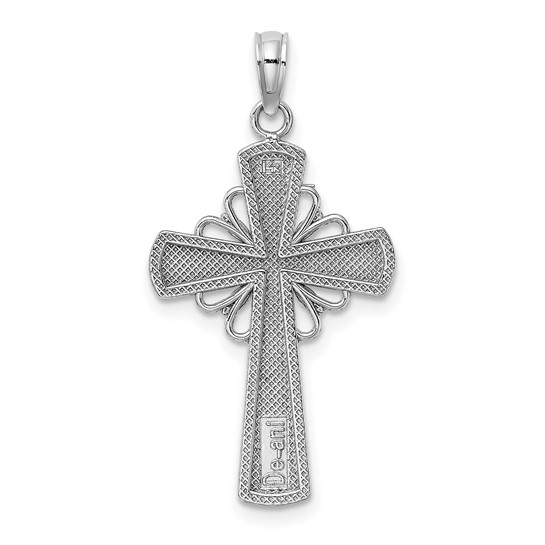 14k white gold cross pendant has beaded edges and a grid pattern. Weight: 1.2 grams. Dimensions: 1in x 5/8in without bail. Fits up to a 3mm wide chain. Made in USA. Available while supplies last.