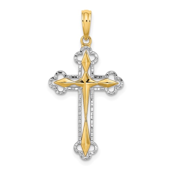 14k two-tone gold diamond cut scallop tip cross pendant is reversible. Weight: 1.3 grams. Dimensions: 11/16in x 1in without bail. Fits up to a 3mm wide chain. Made in Peru. Ships from USA.