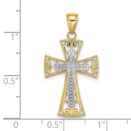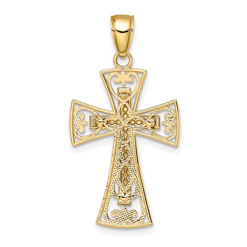 14k yellow gold cut-out filigree crusader cross pendant has a beaded Latin cross in the center. Weight: 1.3 grams. Dimensions: 11/16in x 1in without bail. Fits up to a 4mm wide chain. Made in Peru. Ships from USA.