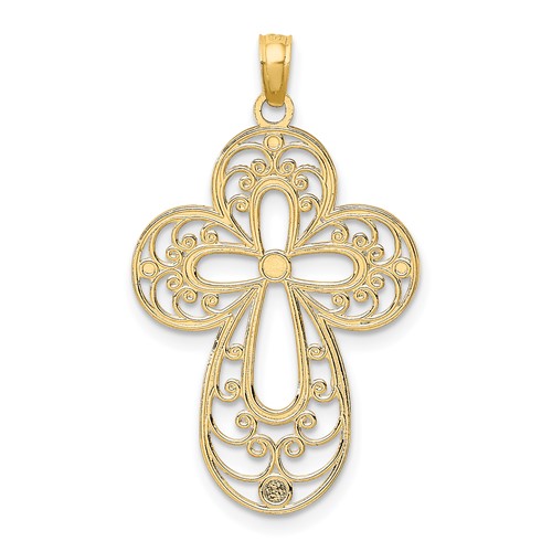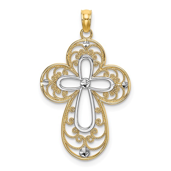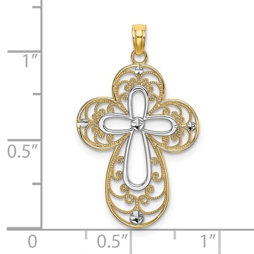 14k yellow gold cross pendant has a cut-out filigree design and rhodium plated center cross. Weight: 1.6 grams. Measures 5/8in x 1in without bail. Fits up to a 3mm wide chain. Made in Peru. Ships from USA.