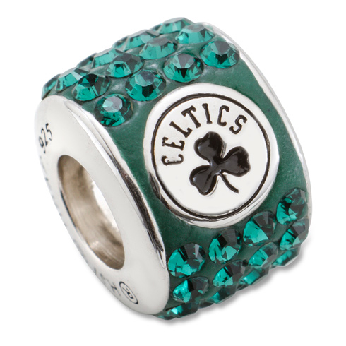 Boston Celtics barrel shaped charm is crafted in sterling silver and is encrusted with green Swarovski crystals. On each side the team logo is sculpted in raised relief and highly polished. Charm has 3/8in diameter with a 4mm opening. Fits all major modular bracelet brands. Packaged in black velvet presentation box.