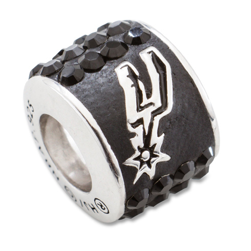 This barrel shaped San Antonio Spurs charm is crafted in sterling silver and is encrusted with black Swarovski crystals. Charm has 3/8in diameter with a 4mm opening. Fits all major modular bracelet brands. Packaged in black velvet presentation box. Available while supplies last.