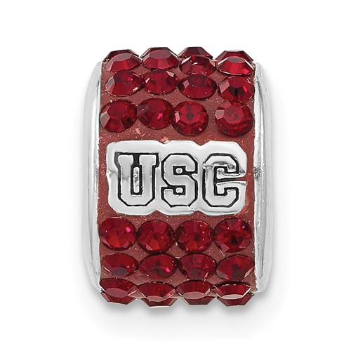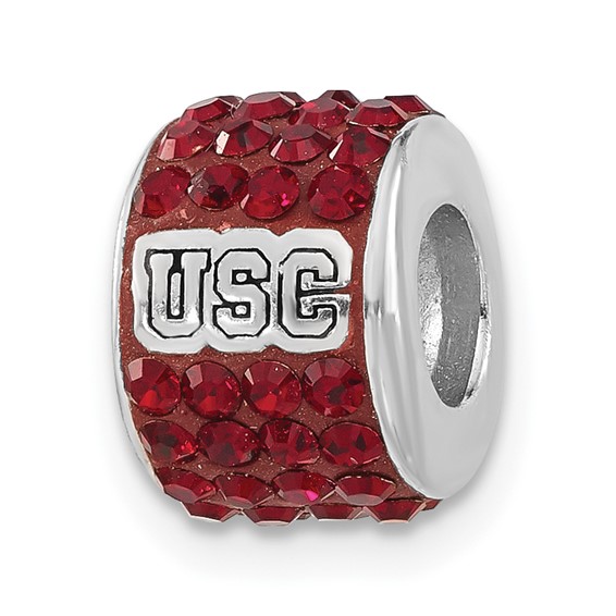This barrel shaped University of Southern California charm is crafted in the finest sterling silver and is encrusted with cardinal Swarovski crystals. On each side your school's logo is sculpted in raised relief and highly polished which provides a striking contrast against the sparkling crystals. Add this to your collection of most cherished charms. Charm has 3/8" diameter with a 4mm opening. Packaged in black velvet presentation box.
