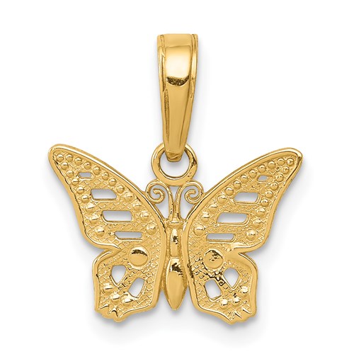 This small 14k yellow gold butterfly pendant has small bead accents. Dimensions: 13mm x 15mm without bail. Weight: 0.7 grams. Made in Peru.