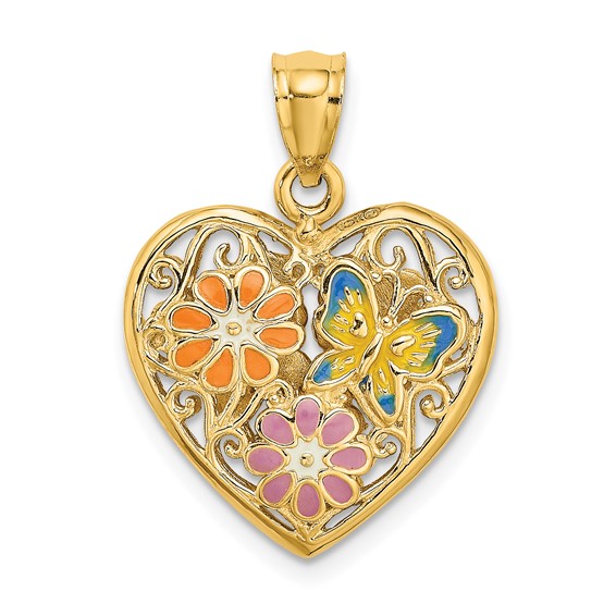 14k yellow gold reversible heart pendant has an enamel butterfly and flowers. Item size: 3/4in x 3/4in without bail. Weight: 3.5 grams. Made in USA. Available while supplies last.