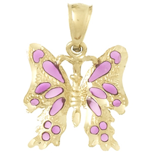 14K Butterfly Pendant with Translucent Purple Enamel. Through the use of transparent enamel, we have created brilliant stained glass pendants as remarkable as authentic church windows! Dimensions: 20mm x 15mm. Weight: 1.3 grams.