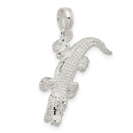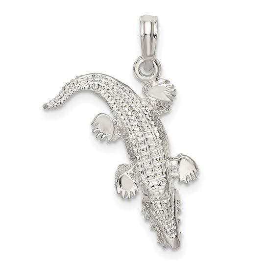 Sterling silver 3-D alligator pendant with moveable mouth. Dimensions: 1/2in x 3/4in without bail. Fits up to a 3mm wide chain. Approximate weight: 2.6 grams. Made in USA.