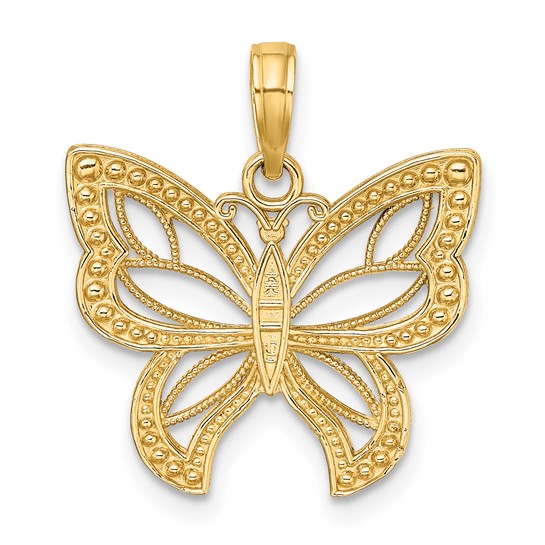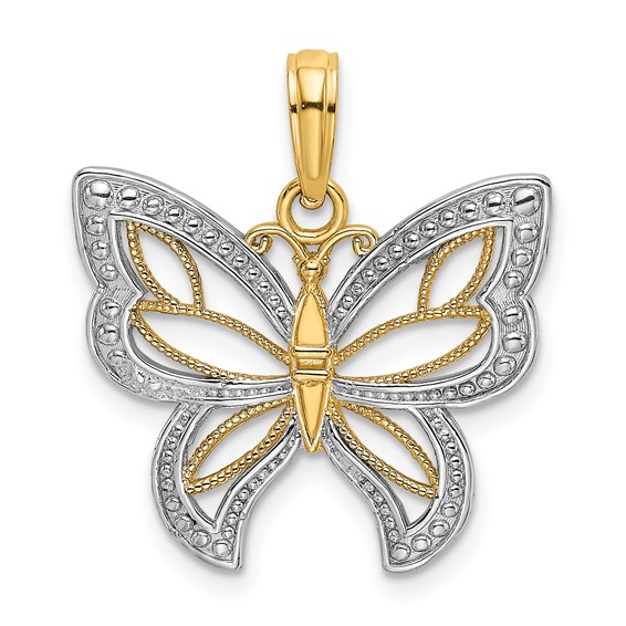 14k two-tone gold beaded butterfly pendant has a cut-out design. Dimensions: 20mm x 20mm. Approximate weight: 2.0 grams.