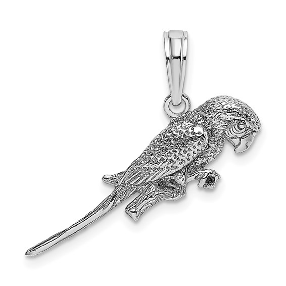 Three dimensional parrot pendant is made of 14kt white gold. Dimensions: 24mm x 8mm. Weight: 2.3 grams. Made in the USA.