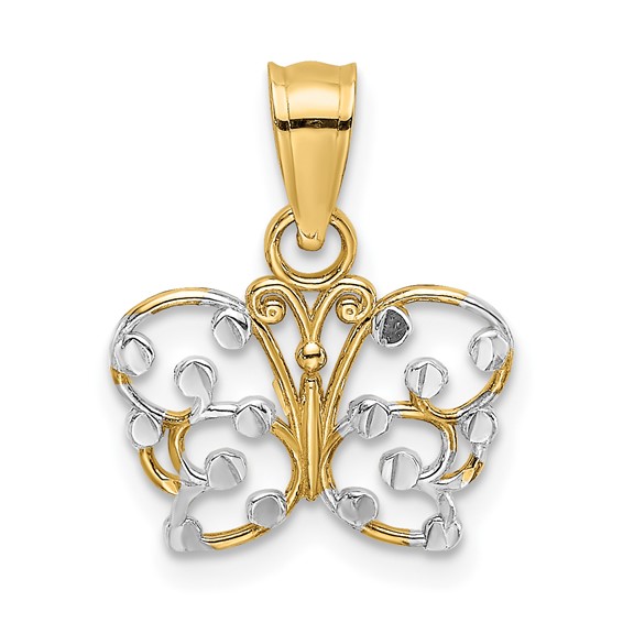 14k two-color gold butterfly pendant with cut out wings and diamond cut accent. Dimensions: 16mm x 13mm. Weight: 0.6 grams. Made in Peru. Ships from USA.