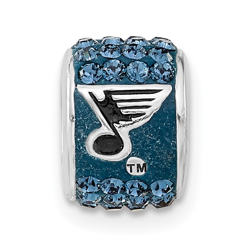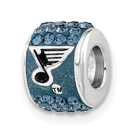 This barrel shaped St. Louis Blues charm is crafted in the finest sterling silver and is encrusted with blue Swarovski crystals. On each side your team's logo is sculpted in raised relief and highly polished which provides a striking contrast against the sparkling crystals.