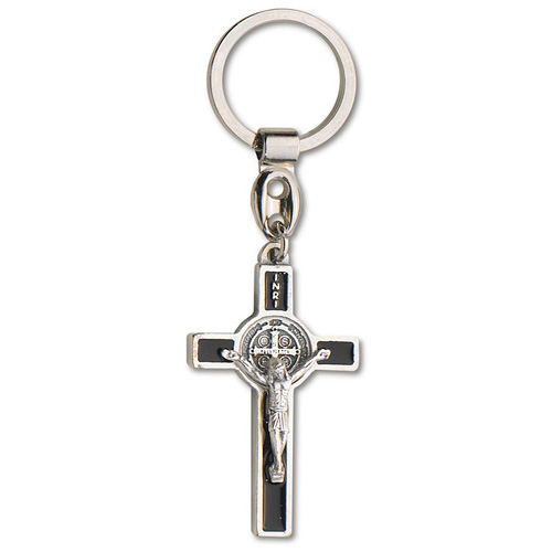 Pack of two Saint Benedict Crucifix Key Ring. Made of genuine pewter. Black enameled and silver oxidized. Measures 2 inches tall without loop, and keyring.
