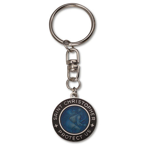 Pack of two Saint Christopher Key Rings with dark blue and black hand painted finish. Silver plated. Made of genuine pewter. Measures 1 inch tall without loop, and keyring.