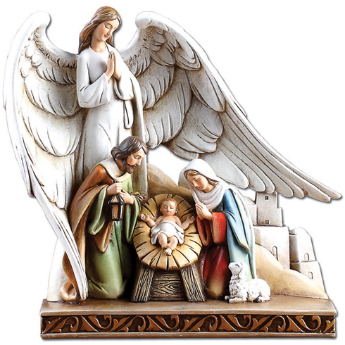 Angel watching over the Holy Family Nativity scene. 8 1/4 inches tall. Made of painted resin. Import.