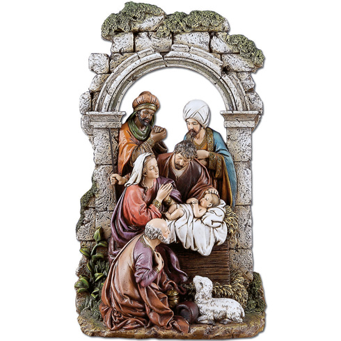 Archway Nativity scene. Measures 11 inches tall. Made of painted resin.
