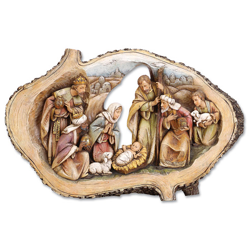 Faux wood carved Holy Family Nativity scene in tree trunk setting. Measures 11 inches tall by 17 inches wide. Made of painted resin.
