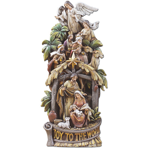 Faux wood carved Joy to the World Nativity scene. Measures 16 1/2 inches tall. Made of painted resin.