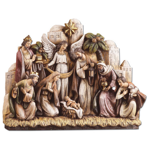 Faux wood carved Nativity scene with Bethlehem citty setting. Angel with the Holy Family. Measures 9 3/4 inches tall by 12 inches wide. Made of painted resin.