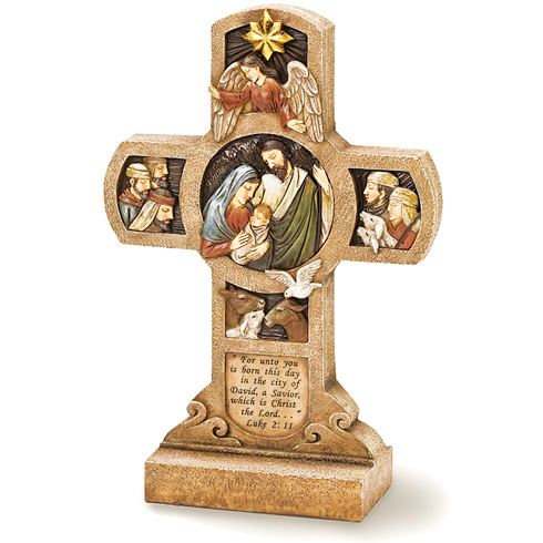 Holy Family Nativity standing cross. Measures 10 inches tall. Made of painted resin. Enscribed- For unto you is born this day in the city of David, a Savior, which is Christ the Lord. Luke 2:11.