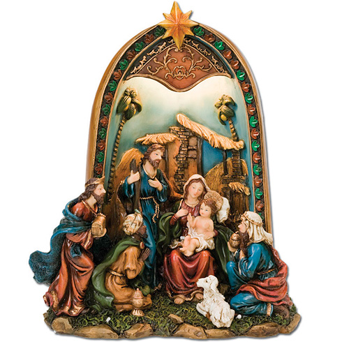 Holy Family lighted Nativity scene. Measures 11 1/2 inches tall. Made of painted resin. U.L. approved cord.