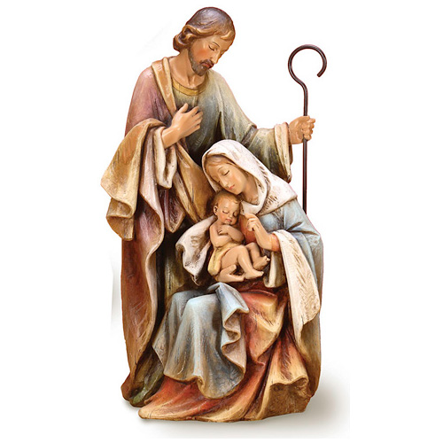 Faux wood carved Holy Family figurine is made of painted resin. Measures 15 inches tall.