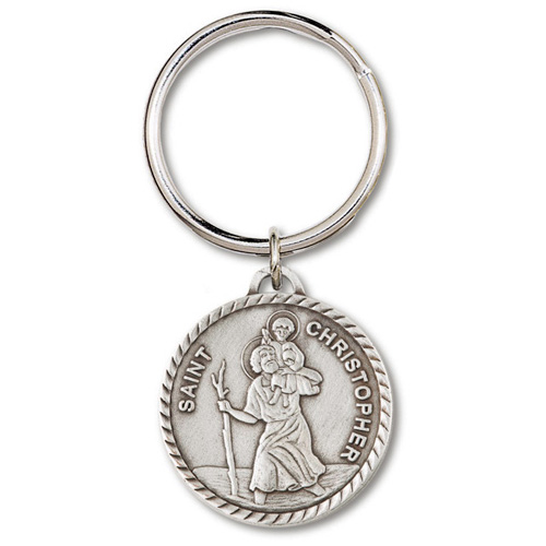 Key ring has a pewter round Saint Christopher medal. Medal diameter: 1 3/16 inch. Set of two.