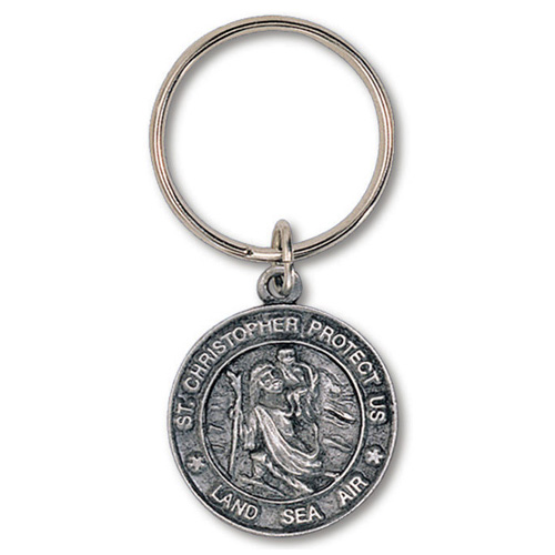 Genuine pewter key ring with 15/16 inch tall antiqued Saint Christopher Medal. Reverse has the inscription: I AM A CATHOLIC PLEASE CALL A PRIEST. Set of two.
