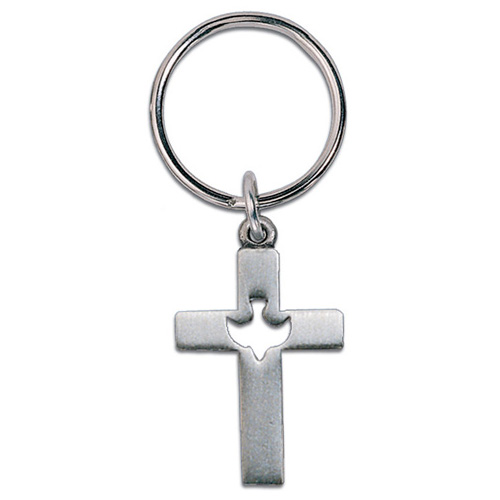 Genuine pewter finish Dove Cross key ring. Measures 1 1/4 inches tall without the loop and bail. Set of two.