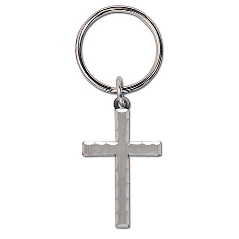 Genuine pewter finish Lord's Prayer Cross key ring. The Lord's Prayer is engraved on the back of the cross. Measures 1 1/2 inches tall without the loop and bail. Set of two.