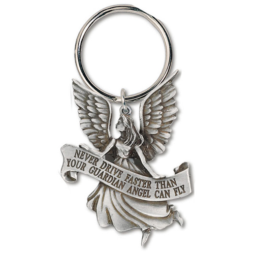 Genuine pewter finish Guardian Angel driver's key ring. Measures 2 1/4 inches tall without the loop and bail. Set of two. Reads: Never drive faster than your guardian angel can fly.