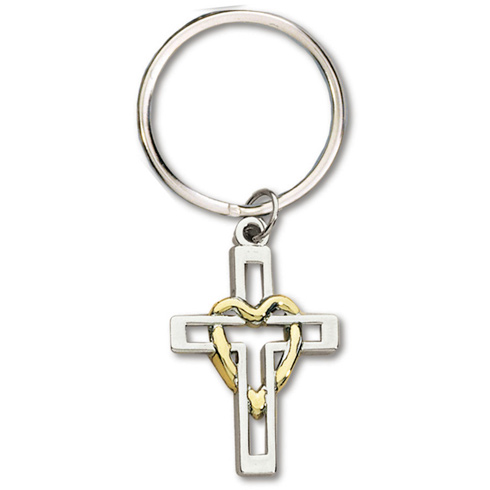 Silver plated cross with gold plated heart key ring. Measures 1 3/8 inches tall without the loop and bail. Set of two.