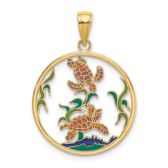 14kt yellow gold with enamel sea turtles in a round shaped pendant. Dimensions: 7/8in x 7/8in. Fits up to a 3mm wide chain. Made in Peru. Ships from USA.