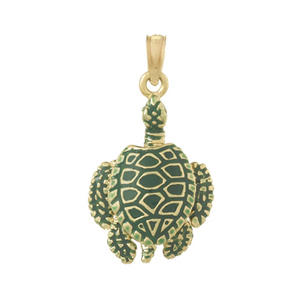 14kt yellow gold with enamel 3-D sea turtle pendant has moveable arms and legs. Dimensions: 26mm x 17.5mm without bail. Made in the USA.