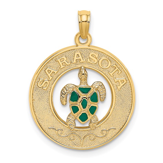 14k yellow gold and enamel Sarasota pendant has a turtle in the middle. Dimensions: 19mm x 19mm without bail. Weight: 1.9 grams. Made in Peru. Ships from USA.