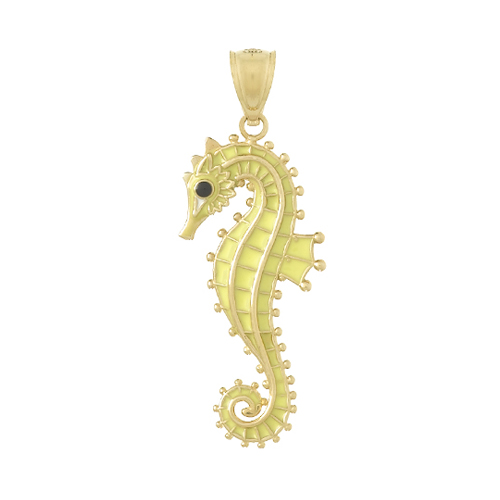 Three dimensional seahorse pendant is made of 14k yellow gold with yellow enamel. Dimensions: 1in x 3/8in without bail. Fits up to a 3mm wide chain. Approximate weight: 2.3 grams. Made in Peru. Ships from USA.
