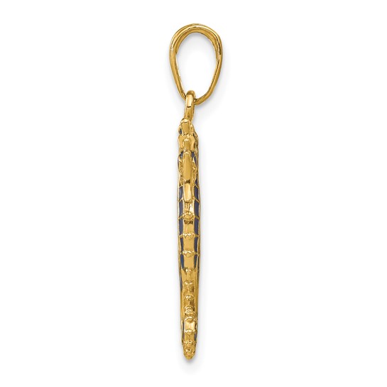 3-D seahorse pendant is made of 14kt yellow gold with blue enamel. Dimensions: 5/8in x 5/16in including bail. Weight: 1.6 grams. Made in the USA.