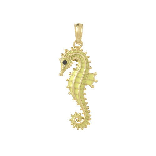 This 3-D seahorse pendant is made of 14k yellow gold with yellow enamel. Dimensions: 7/8in x 5/16in without bail. Fits up to a 3mm wide chain. Weight: 1.6 grams. Made in Peru. Ships from USA.